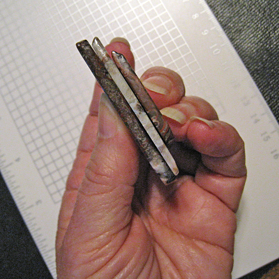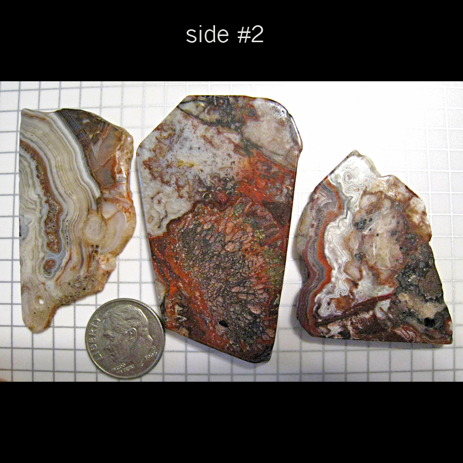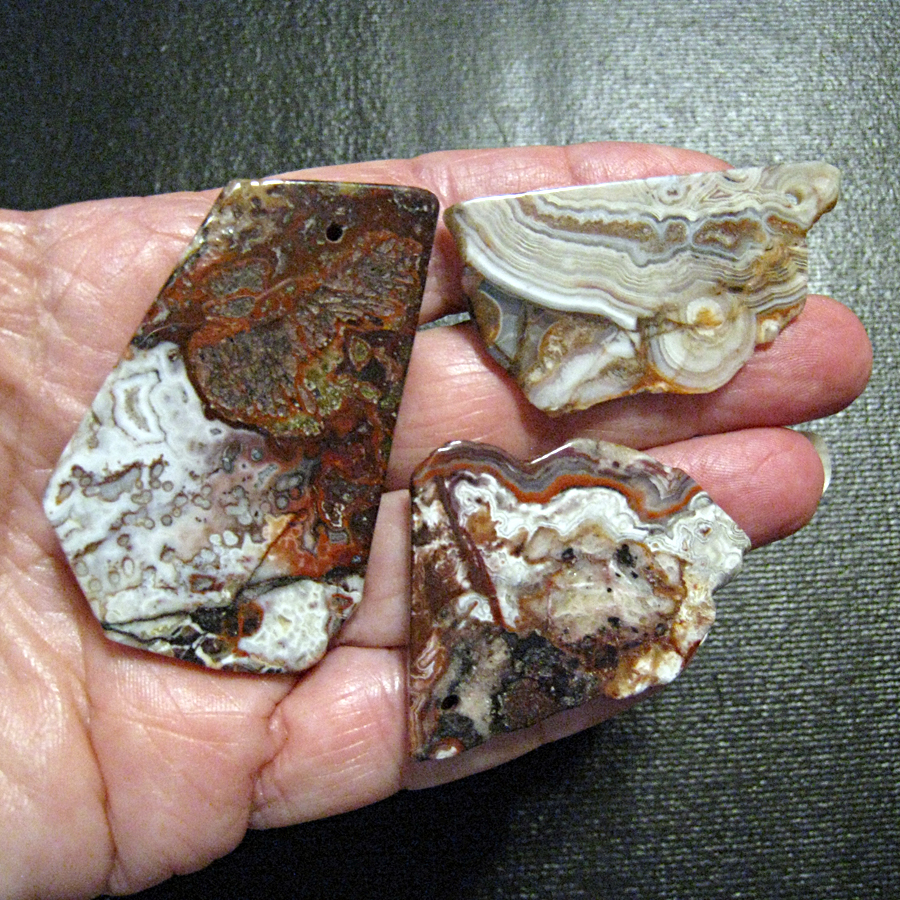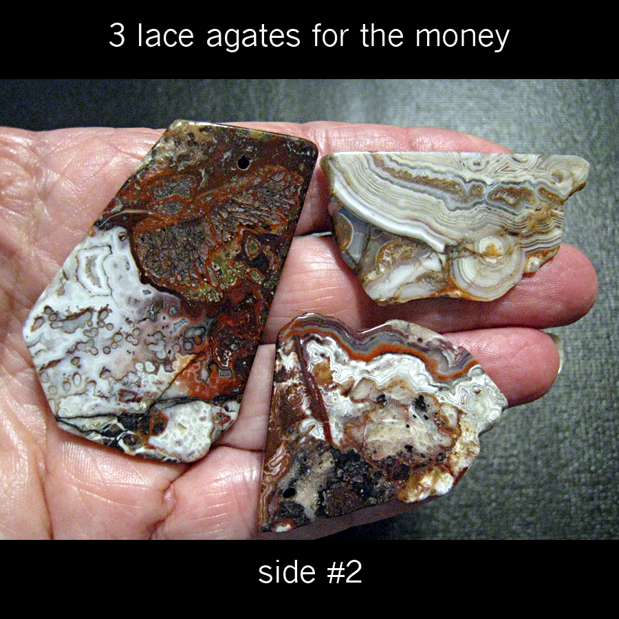 3 lace agate slabs for the money. Holes drilled. See pics for size info.