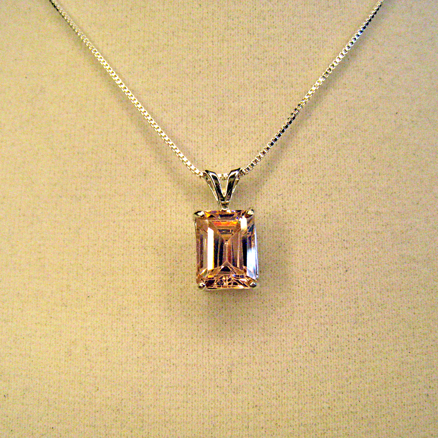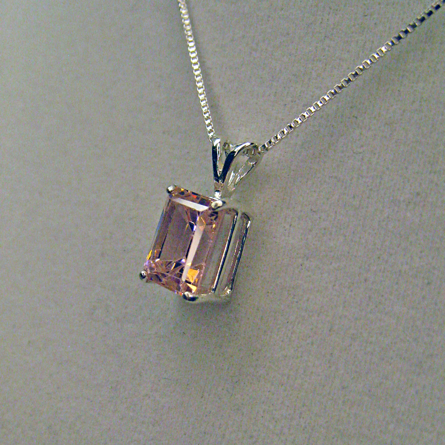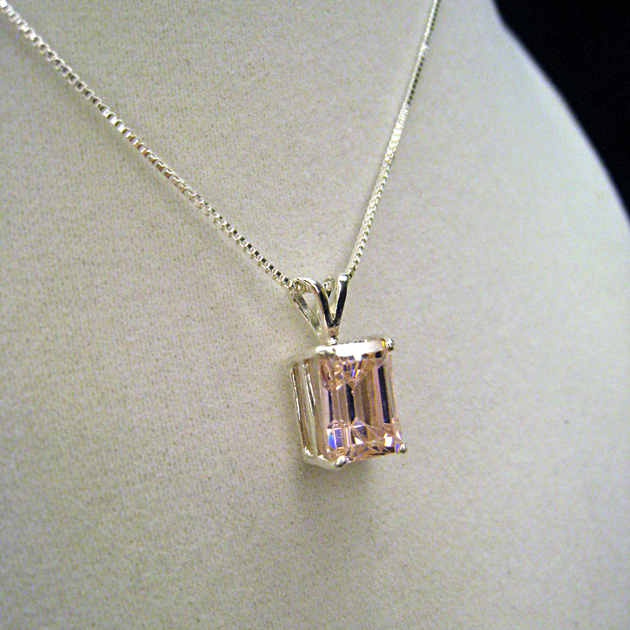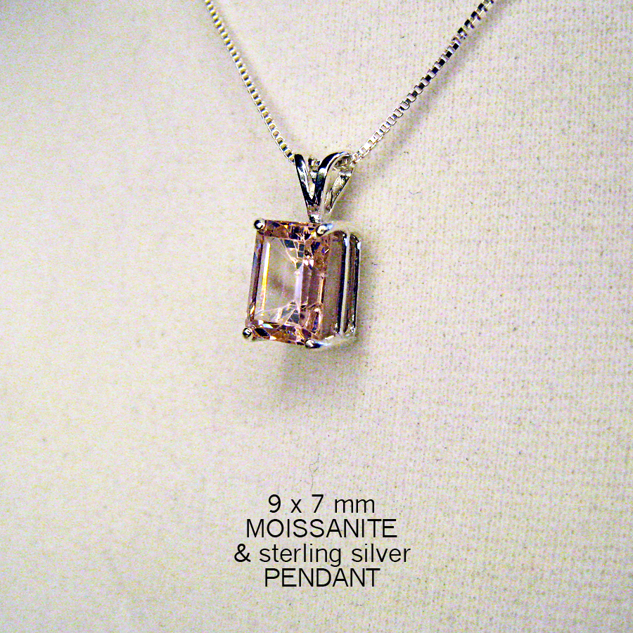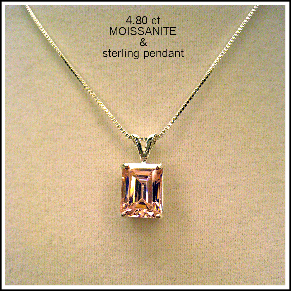4.80 pink moissanite emerald cut gemstone measures approx 9x7mm mounted in sterling silver rabbit earred pendant. Use with your chain or check out our inventory. Shipped promptly, insured and gift boxed. We use PayPal for shipping and payment.