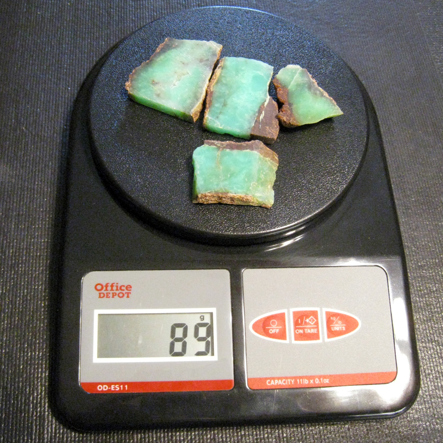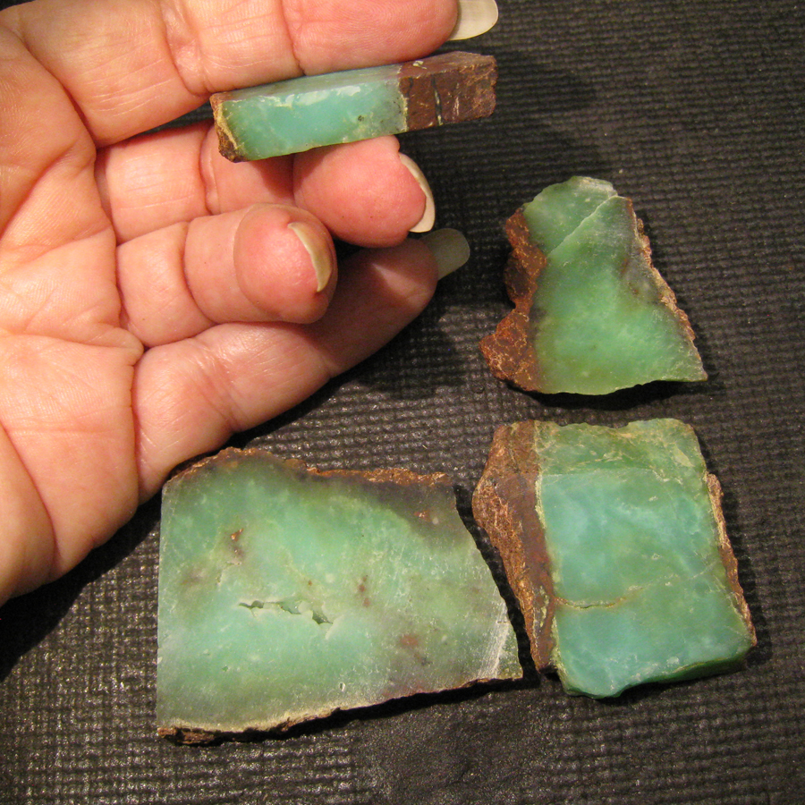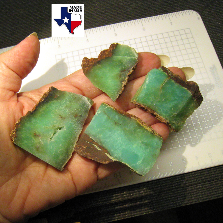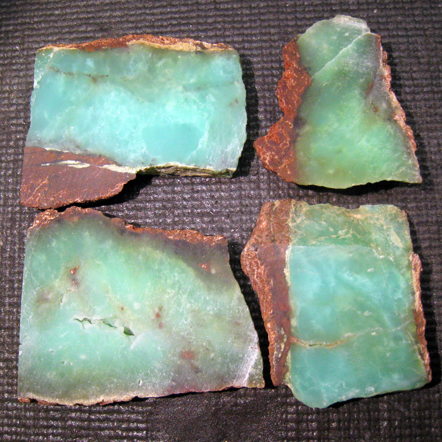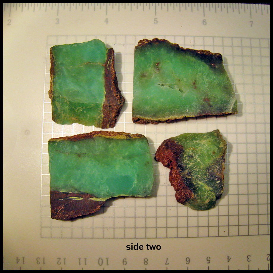 All four slabs of chrysoprase for the money. Approx. 1/4 inch thick. One is the "butt end".