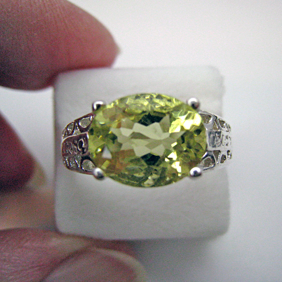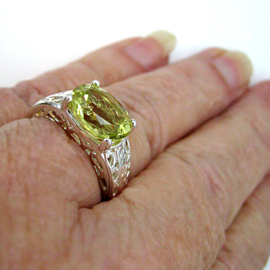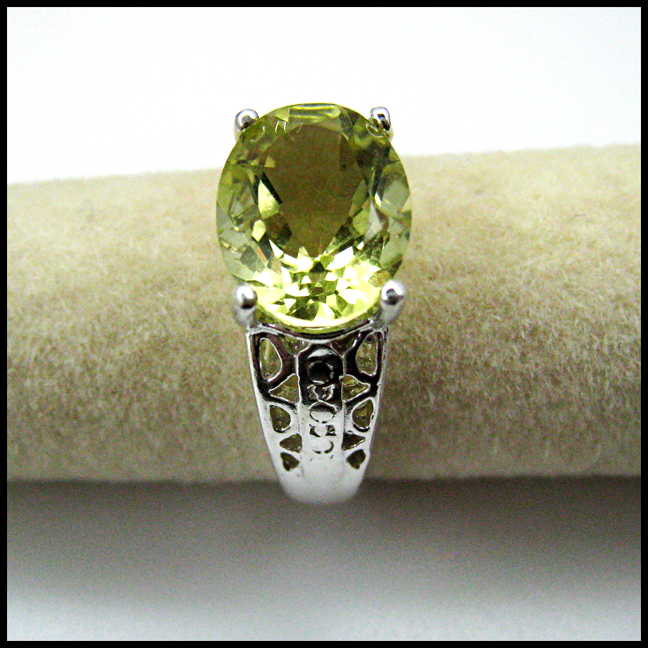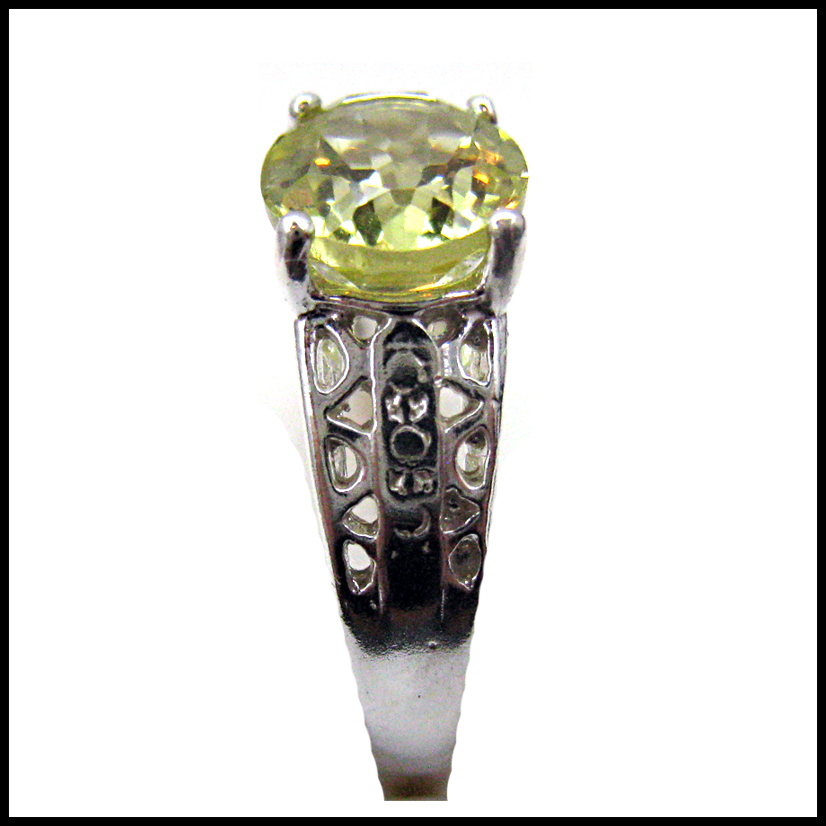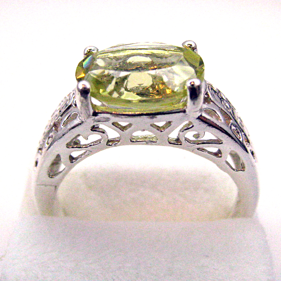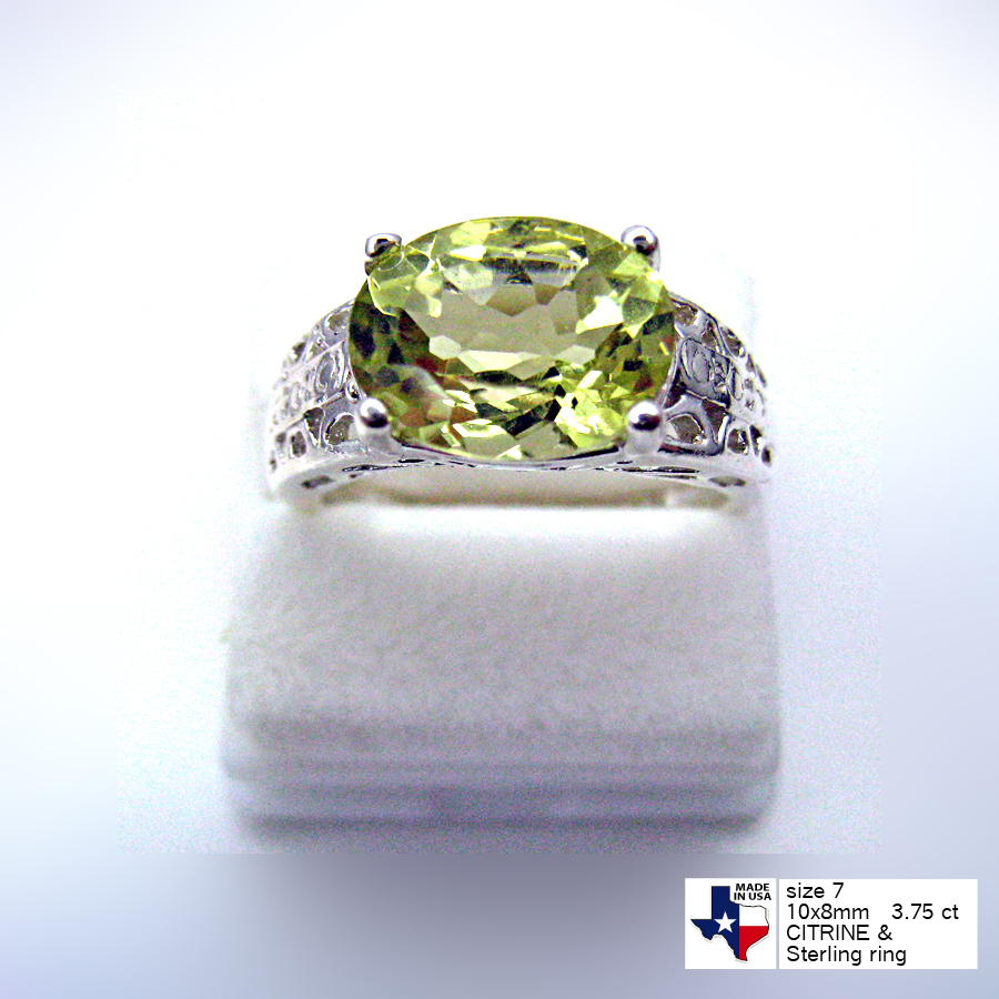 Lemon Citrine oval gemstone measures 10x8mm and weighs 2.45 carats mounted in etched and pierced sterling silver. Ladies size 7 band.