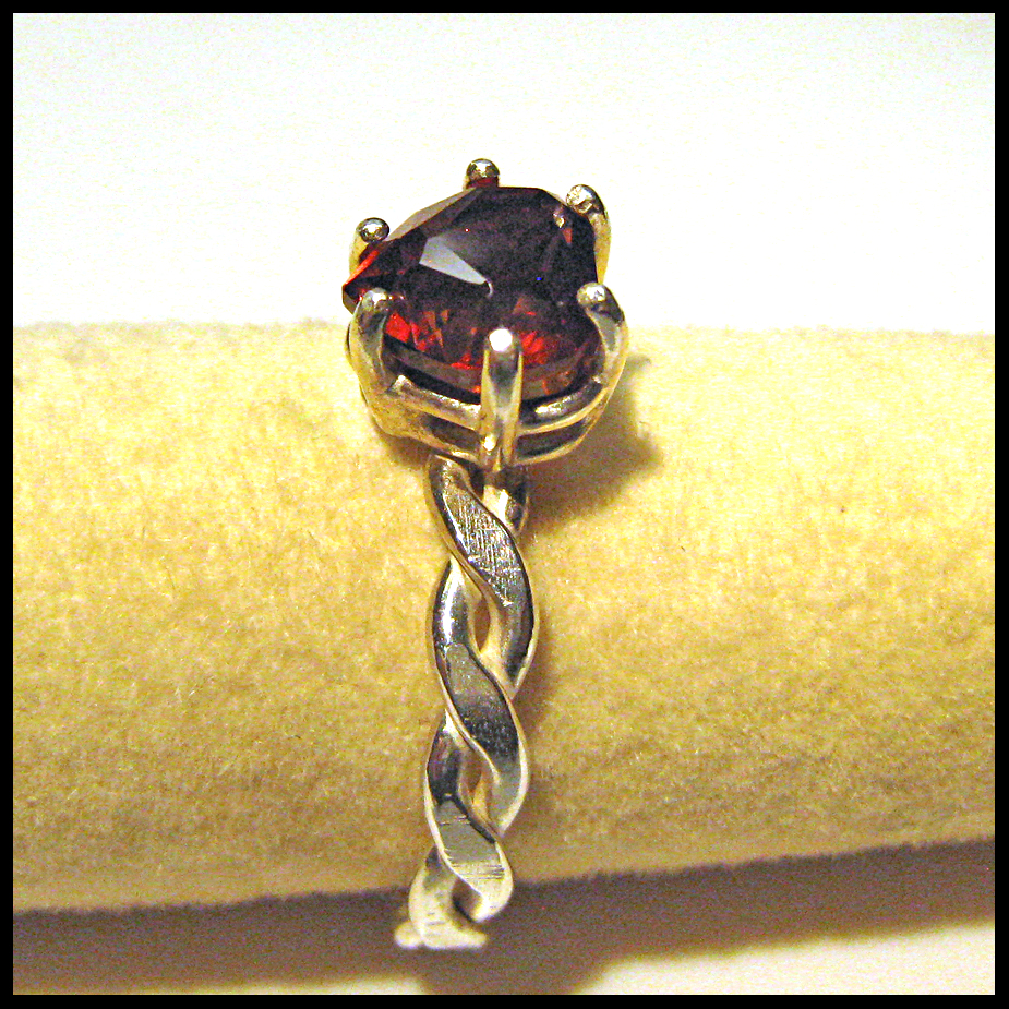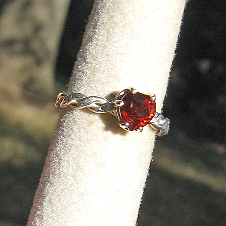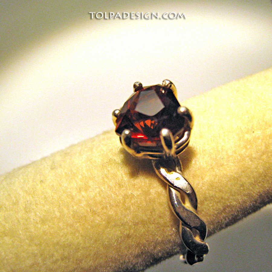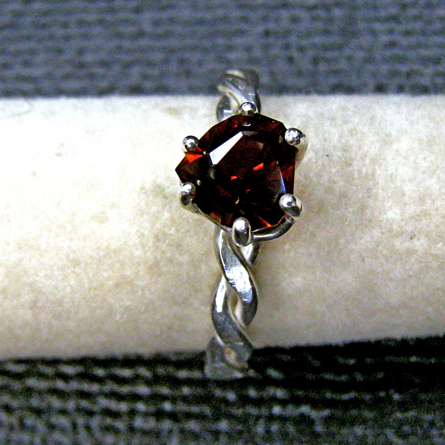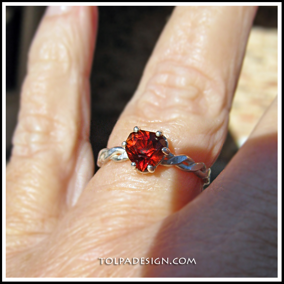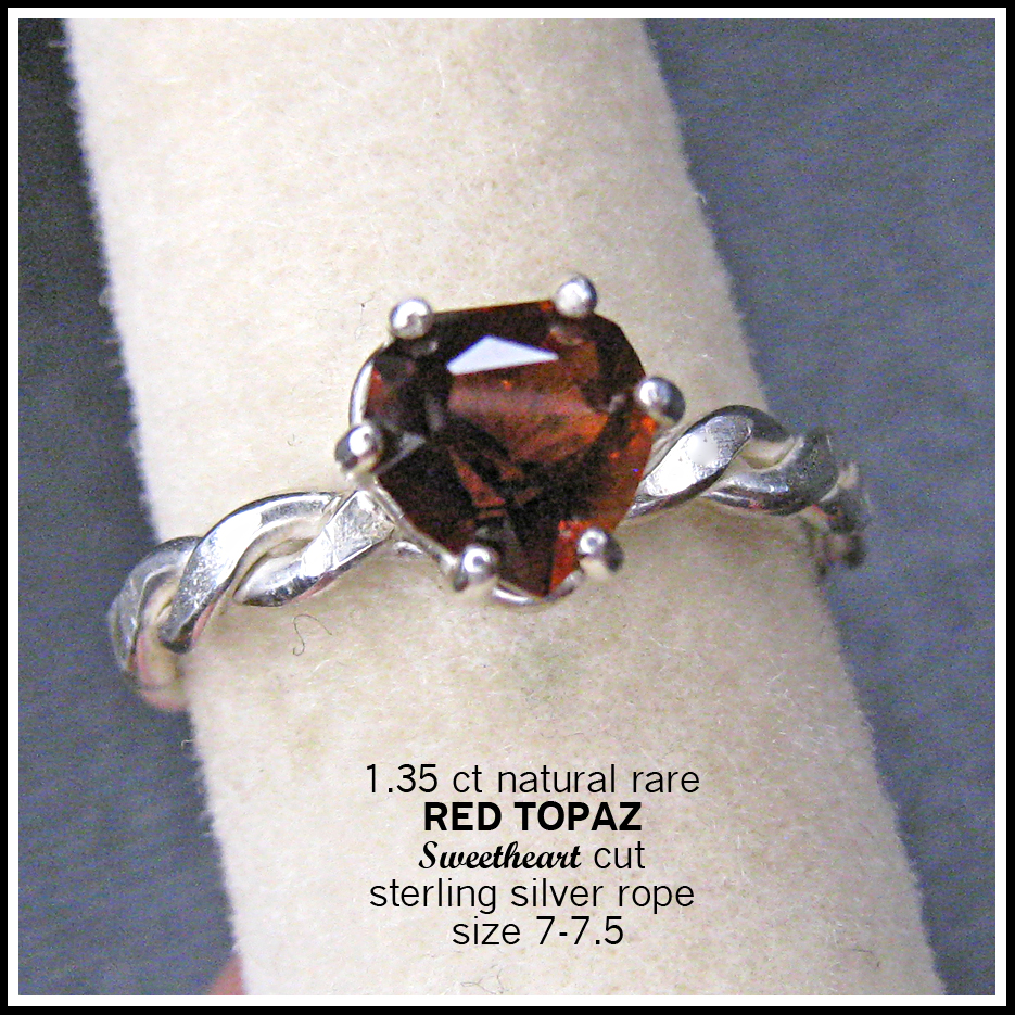 Rare red topaz gem hand cut in our Tolpa studio using the "sweetheart" cut. Measures 6.66 x 6.78mm. Weighs 1.35 carats. Red is a very rare and valuable color for topaz. This gem comes from an old inventory of topaz rough crystals from Mexico. The topaz is pleochroic and changes color and brilliance with varying lighting conditions and when viewed from different angles (see pics). Refractive index tested for authenticity. Band is twisted rope sterling silver. Fits a 7 - 7.5 finger. Shipped promptly, fully insured and gift boxed.
